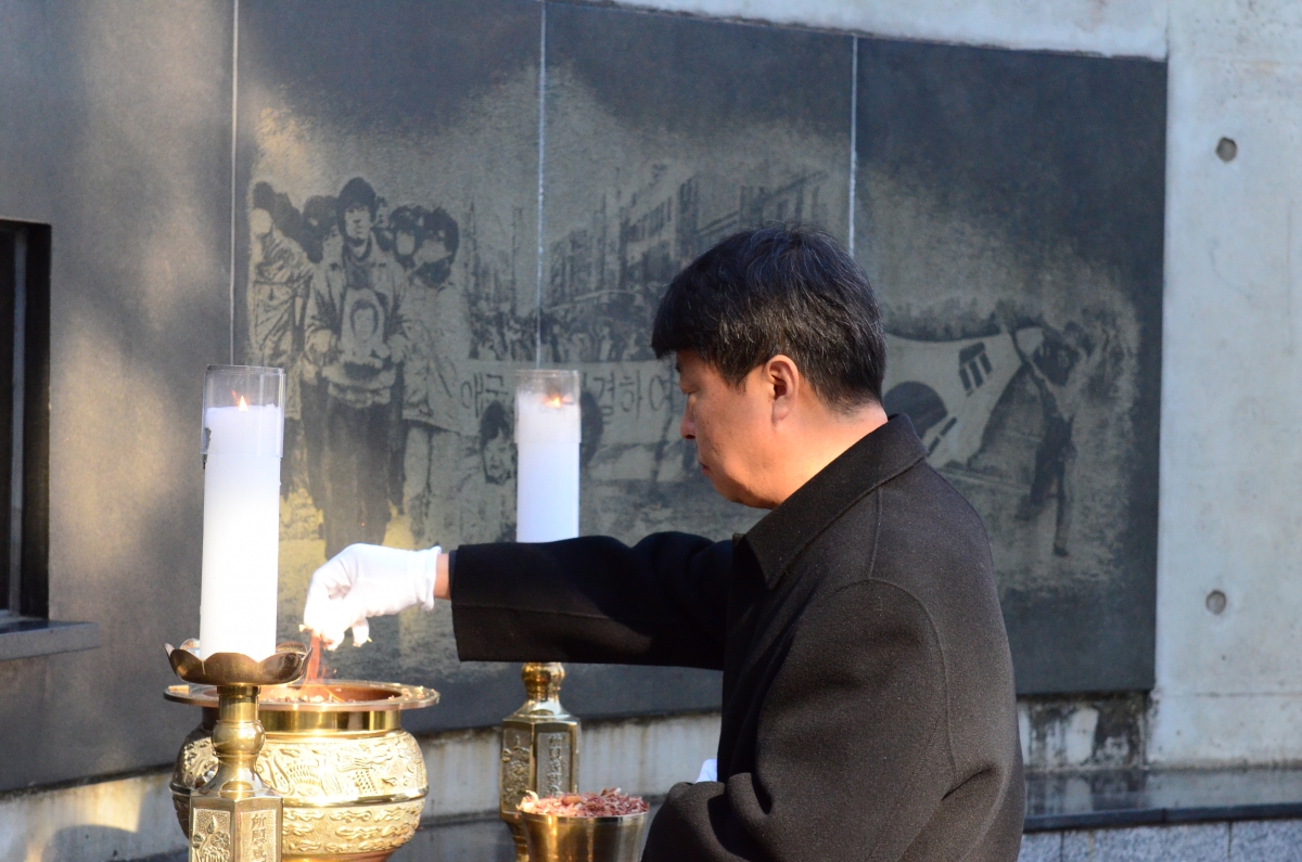 참배 후 이행봉 (사)부산민주항쟁기념사업회 이사장은 방명록에 "자주독립 영령이시여! 애국민주 영령이시여! 올해는 훼손된 이 땅의 민주주의가 온전히 복원이 되는 한 해가 되는데 힘을 보태주시옵소서"라는 글을 남겼습니다.