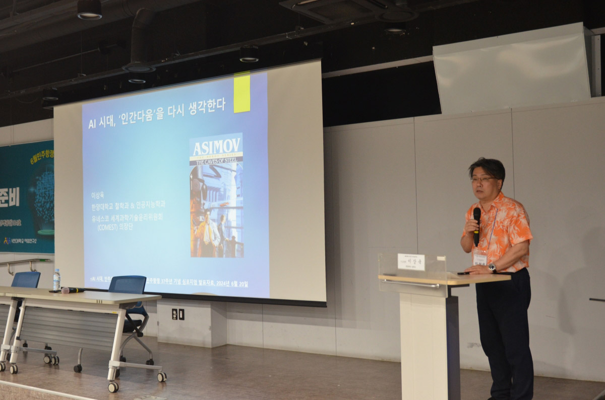 이행봉 부산민주항쟁기념사업회 이사장의 개회사에 이어 정대성 민주주의사회연구소장의 환영사가 있었습니다. 이상욱 한양대 철학과 교수의 "AI시대, '인간다움'을 다시 생각한다" 기조발제가 이어졌습니다.