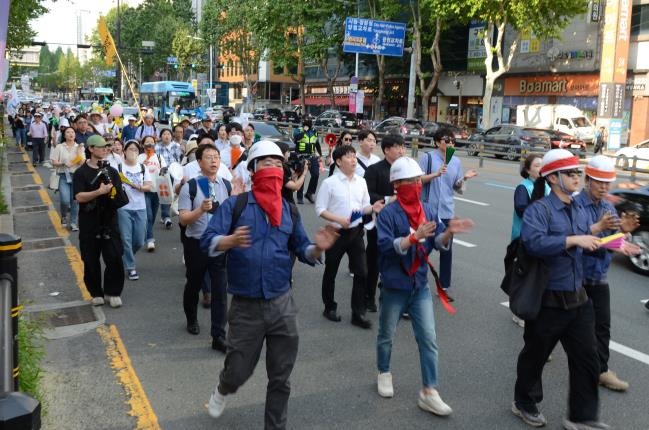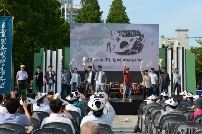 지난 6월 10일, 6월민주항쟁 36주년 부산기념행사가 열렸습니다. 오후 2시부터 송상현 광장에서 시민과 함께하는 시민참여 부스를 열었으며 4시부터 부산기념식을 시작했습니다. 기념식 후 서면까지 행진하는 재현 퍼포먼스도 이어졌습니다. 1987년 6월, 그때처럼 '호헌철폐 독재타도'를 외치며 만장을 들고, 어깨띠를 매고, 일하다 입고 나온 넥타이부대며 헬맷을 쓴 노동자들, 청년들이 2023년 6월 10일에 부산의 중심을 걸었습니다. '한뜻으로, 민주주의!'를 외쳤던 여름날이었습니다.