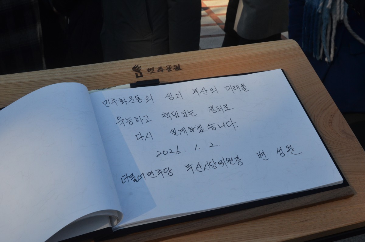 더불어민주당 부산시당 참배 작성자 민주공원 작성일 2026-01-02 조회수 75 - 첨부파일 : 260102 사진_더불어민주당 부산시당 참배 1.JPG (3.8M) - 다운로드 1 2026-01-02 13:34:39 - 첨부파일 : 260102 사진_더불어민주당 부산시당 참배 2.JPG (4.0M) - 다운로드 1 2026-01-02 13:34:39 - 첨부파일 : 260102 사진_더불어민주당 부산시당 참배 3.JPG (4.0M) - 다운로드 1 2026-01-02 13:34:39 - 첨부파일 : 260102 사진_더불어민주당 부산시당 참배 4.JPG (3.8M) - 다운로드 1 2026-01-02 13:34:39 - 첨부파일 : 260102 사진_더불어민주당 부산시당 참배 5.jpg (4.0M) - 다운로드 1 2026-01-02 13:34:39 - 첨부파일 : 260102 사진_더불어민주당 부산시당 참배 6.jpg (2.5M) - 다운로드 1 2026-01-02 13:34:39 목록 본문 2026년 1월 2일(금) 더불어민주당 부산시당에서 민주공원을 찾아 넋기림마당에서 민주열사와 호국영령에 참배했습니다.참배 후 더불어민주당 변성완 부산시당위원장은 "민주화운동의 성지 부산의 미래를 유능하고 책임있는 정치로 다시 설계하겠습니다."라는 글을 남겼습니다. 목록 목록으로