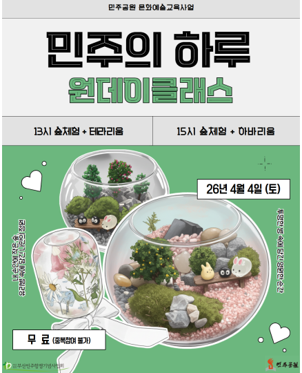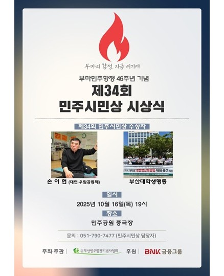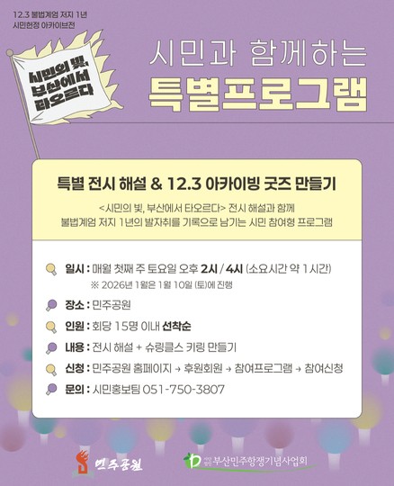 팝업존 가장 최근에 등록된 6개 게시물이 메인화면에 표시됩니다. 전체 62건 민주의하루 민주공원 2026-03-12 문형배 전헌법재판관 특강 <탄핵결정으로 본 민주주의> 민주공원 2026-03-10 2026 제13회 태극기 그리기 대회 일정 변경 민주공원 2026-02-20 12.3 불법계엄 저지 1년 시민헌정 아카이브전 <시민의 빛, 부산에서 타오르다> 민주공원 2025-12-01 12.3 불법계엄 저지 1년 시민헌정 아카이브전 특별 해설&체험 프로그램 민주공원 2025-12-01 2025 민주공원 생활예술문화축전 민주공원 2025-10-22 제34회 민주시민상 시상식 민주공원 2025-10-01 2025년 추석 연휴 민주항쟁기념관 휴관 안내 민주공원 2025-09-26 제1회 부마민주항쟁 기념 걷기대회 민주공원 2025-09-22 시민추진위원으로 함께 해 주십시오 민주공원 2025-09-12 2025 생활예술문화축전 '청(소)년 예술제' 동아리(개인/단체) 모집 민주공원 2025-09-10 2025 부산민주공원 교육프로그램 신청 안내 민주공원 2025-09-09 1페이지 2페이지 3페이지 4페이지 5페이지 6페이지 팝업존 검색 검색대상 제목 내용 제목+내용 회원아이디 회원아이디(코) 글쓴이 글쓴이(코) 검색어 필수 검색