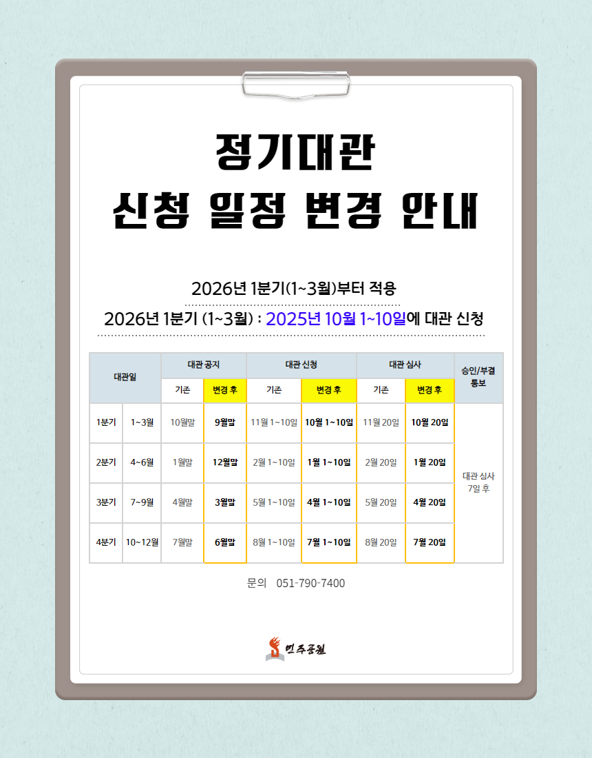 부산민주공원 공연장‧전시실 정기대관 신청 일정이 변경됩니다.
