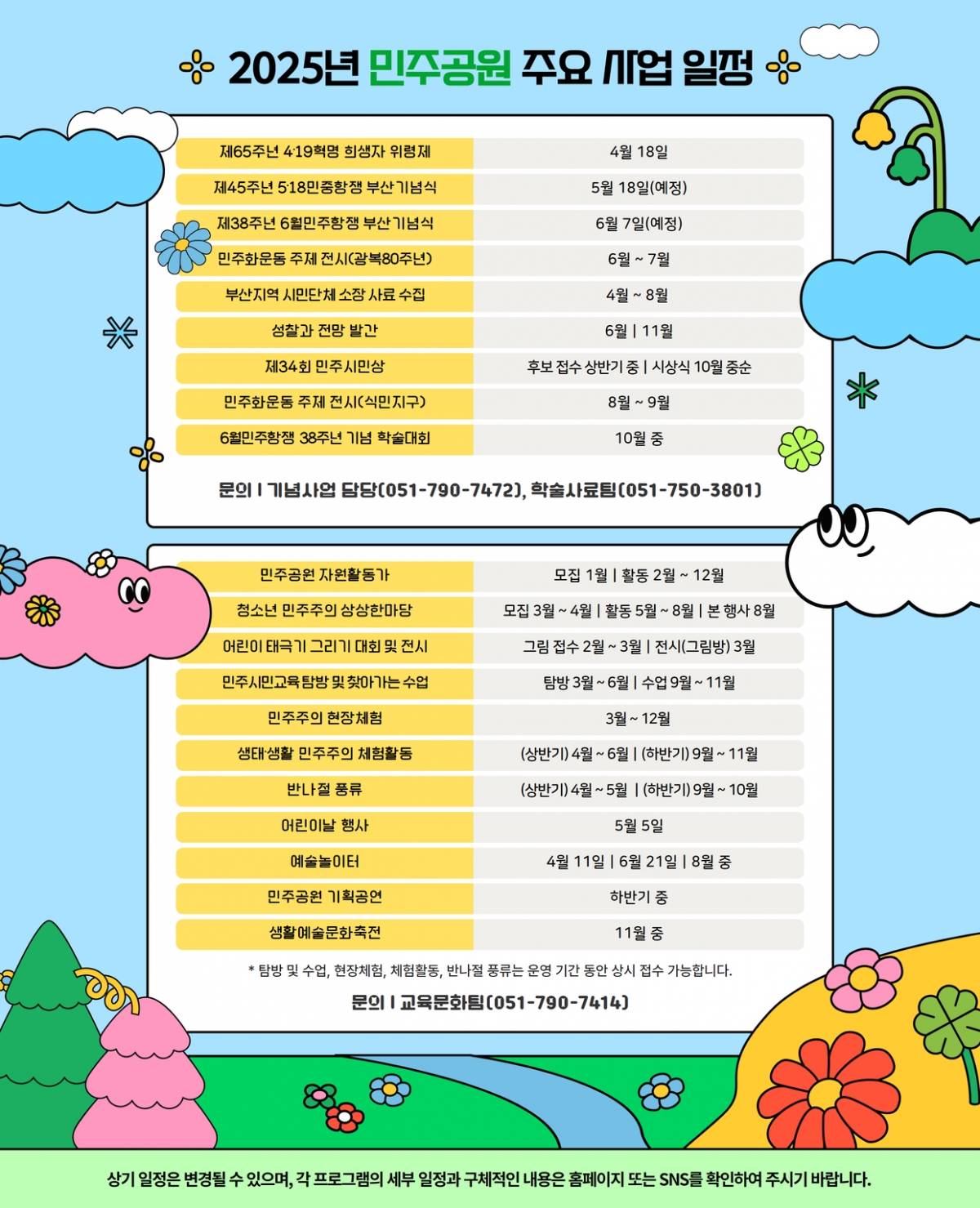 상기 일정은 변경될 수 있으며, 각 프로그램의 세부 일정과 구체적인 내용은 민주공원 홈페이지와 인스타그램을 통해 확인 바랍니다.
