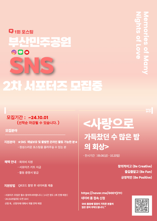 2차 추가 모집) 부산민주공원 SNS 서포터즈 모집 <사랑으로 가득찼던 수많은 밤의 회상>