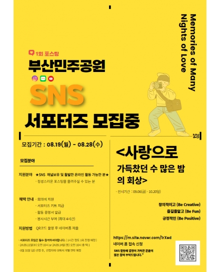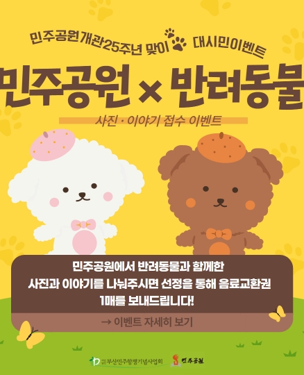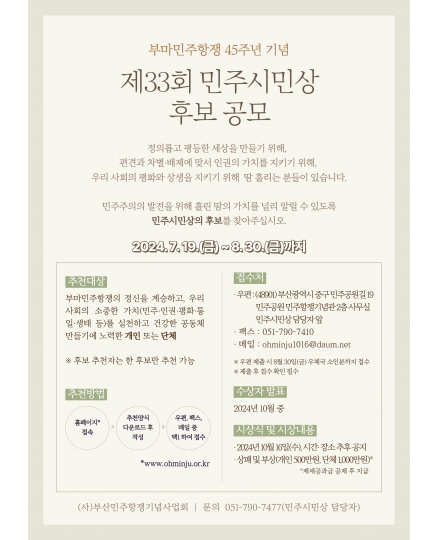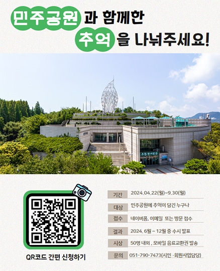 팝업존 가장 최근에 등록된 6개 게시물이 메인화면에 표시됩니다. 전체 62건 사랑으로 가득찼던 수많은 밤의 회상 - Memories of Many Nights of Love 민주공원 2024-08-26 부산민주공원 (사랑으로 가득찼던 수많은 밤의 회상> 전시 SNS 서포터즈 모집 민주공원 2024-08-16 제33회 민주시민상 후보자 추천 공고 민주공원 2024-08-08 민주공원x반려동물 사진·이야기 접수 이벤트 민주공원 2024-08-08 매직컬 환경 퍼포먼스 '에코백' 민주공원 2024-07-26 [카카오같이가치 모금 목표 달성] 기억해야 할 사람들 : 민주열사 명패달기 프로젝트 민주공원 2024-07-06 민주공원과 함께한 추억을 나눠주세요! 민주공원 2024-05-19 2024 민주공원 반나절풍류 드로잉피크닉 운영 안내 민주공원 2024-05-19 제11회 삼일절 맞이 어린이 태극기 그리기 대회 민주공원 2024-02-07 2024 민주공원 자원활동가를 모집합니다~ 민주공원 2023-12-29 2024년 새해인사 민주공원 2023-12-29 민주항쟁 기념 학술심포지엄 민주공원 2023-12-16 1페이지 2페이지 3페이지 4페이지 5페이지 6페이지 팝업존 검색 검색대상 제목 내용 제목+내용 회원아이디 회원아이디(코) 글쓴이 글쓴이(코) 검색어 필수 검색