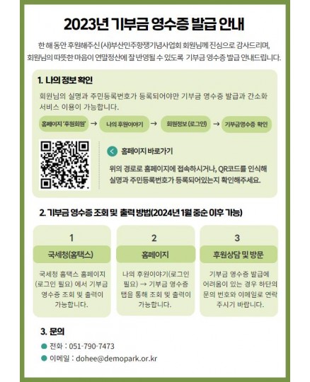 팝업존 가장 최근에 등록된 6개 게시물이 메인화면에 표시됩니다. 전체 62건 2023년 기부금 영수증 발급 안내 민주공원 2023-12-16 찾아가는 부산 민주 역사길 스토리투어 민주공원 2023-12-16 1페이지 2페이지 3페이지 4페이지 5페이지 6페이지 팝업존 검색 검색대상 제목 내용 제목+내용 회원아이디 회원아이디(코) 글쓴이 글쓴이(코) 검색어 필수 검색