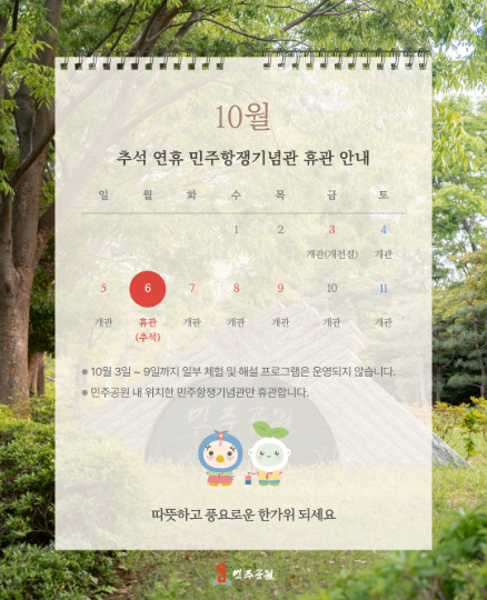 민주공원 민주항쟁기념관은 10월 6일(월) 추석 당일 휴관 합니다.