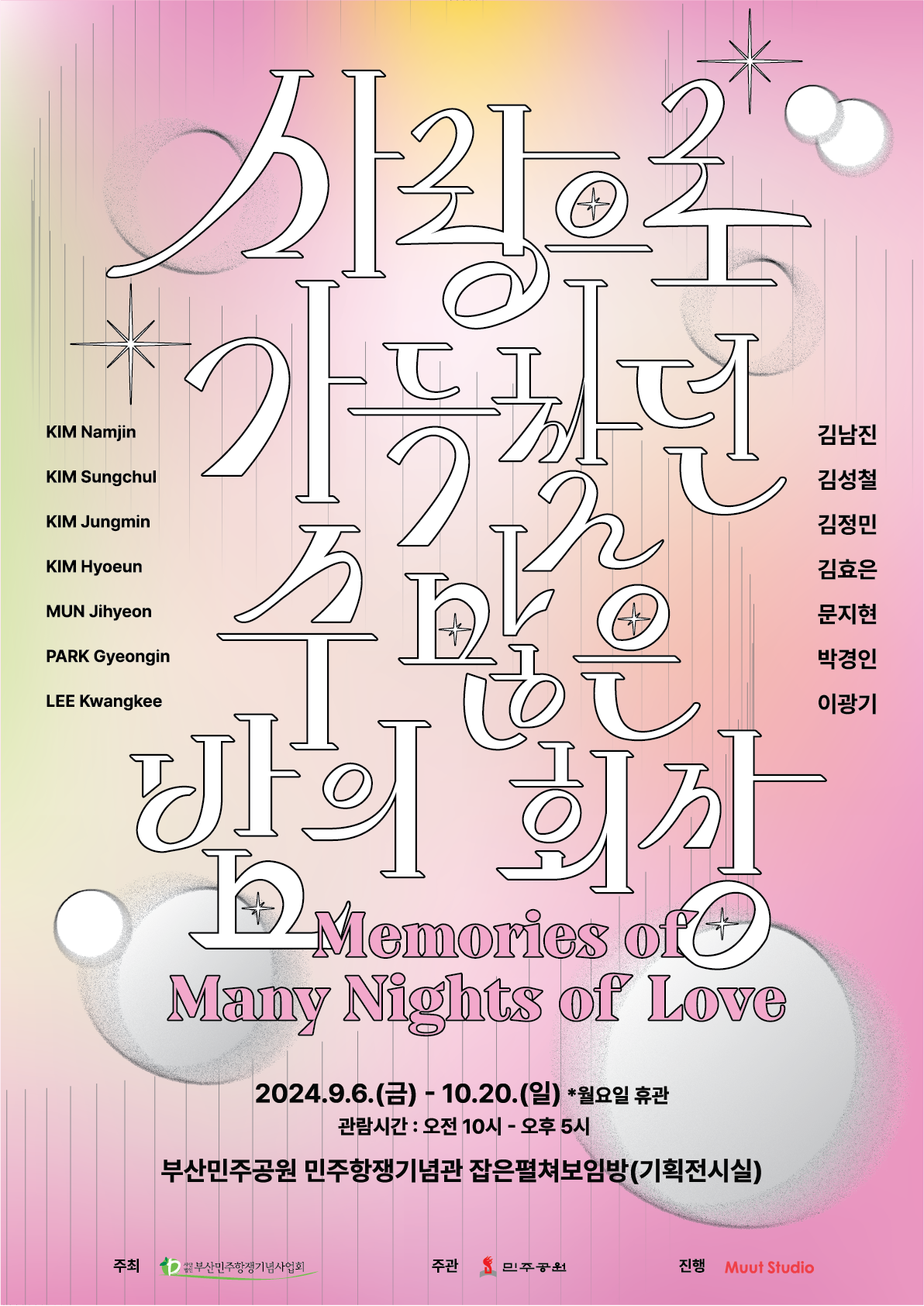 ○ 전시 개요: 이번 전시는 "사랑으로 가득찼던 수많은 밤의 회상"이라는 주제로, 다양한 작가들이 사랑과 기억, 그리고 그로부터 오는 감정을 시각적으로 표현한 작품들을 선보입니다. 각기 다른 시각에서 풀어낸 사랑의 이야기가 모여, 깊은 감동과 생각을 불러일으킬 것입니다. 부산민주공원에서 열리는 이번 전시에 많은 관심과 참여 부탁드립니다.