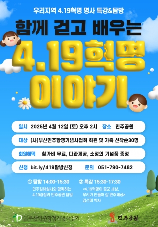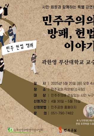 참여프로그램 전체 4건 (1페이지) 전체보기 모집예정 모집중 모집마감 진행중 종료 전체 공연 전시 강연 행사 축제 체험 외부 기타 검색 4 모집중 강연 문형배 전헌법재판관 특강 <탄핵결정으로 본 민주주의> <민주주의 : 세 번의 만남> 첫 번째 만남. 2026.04.11 ~ 2026.04.11 3 종료 강연 [체험&특강] <시월에 만난 민주이야기> 부마민주항쟁 46주년 기념 체험&특강 프로그램 2025.10.25 ~ 2025.10.25 2 종료 강연 [마감]민주주의의 방패, 헌법 이야기 시민·회원과 함께하는 특별 강연회 2025.05.20 ~ 2025.05.20 1 종료 강연 [마감]함께 걷고 배우는 4·19혁명 이야기 회원 가족과 함께 걷고 배우는 4·19혁명 이야기 프로그램 2025.04.12 ~ 2025.04.12