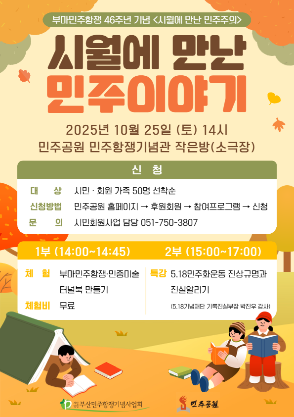 1979년 10월, 부산대학교에서 타오른 불꽃은 직장인, 학생, 상인 등 다양한 시민들의 참여로 번져나가며, 함께 싸우고 연대하는 힘이 되어었습니다. 그 불꽃은 마침대 유신체제의 종식을 이루어내는 불씨가 되었습니다. 민주공원은 부마항쟁 46주년을 맞아, 그 의미를 함께 되새기고 지금의 우리 삶과 연결해 보는 자리를 준비했습니다. 체험과 이야기 나눔 속에서 민주주의가 가진 힘과 가치를 다시 느껴보시길 바랍니다.