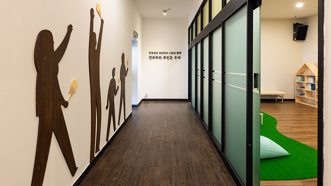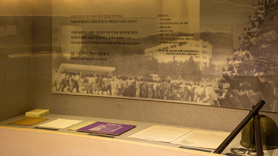 민주항쟁기념관 늘펼쳐보임방은 부산 시민들의 자랑스러운 민주항쟁의 발자취를 돌아보고 그 계승과 발전을 통해 부산의 희망찬 미래와 소중한 포부를 전망하고자 꾸며진 상설전시 공간입니다.