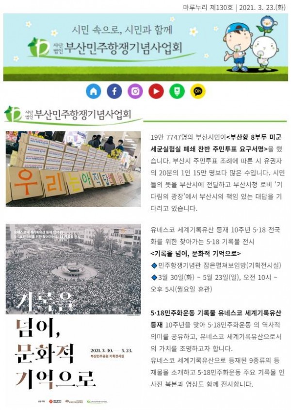 (사)부산민주항쟁기념사업회 뉴스레터 <마루누리> 130호를 보내드립니다! 3월 30일부터 민주공원 잡은펼쳐보임방(기획전시실)에서 여는 유네스코 세계기록유산 등재 10주년 5·18 전국화를 위한 찾아가는 5·18 기록물 전시 <기록을 넘어, 문화적 기억으…