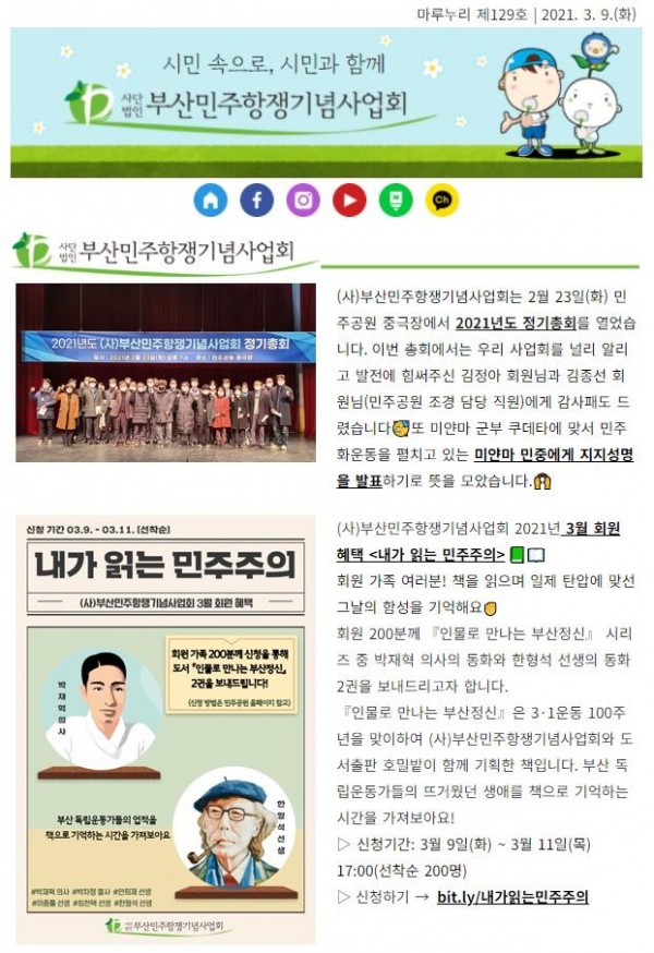 (사)부산민주항쟁기념사업회 뉴스레터 <마루누리> 129호를 보내드립니다! 새 단장한 뉴스레터가 어떤지 회원 가족들과 시민 여러분의 의견이 궁금하기도 합니다(사)부산민주항쟁기념사업회 2021년 정기총회 소식과 3월의 회원 혜택 <내가 읽는 민주주의>…