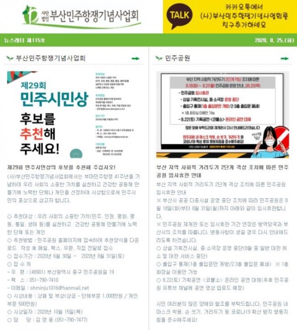 (2020.8.25)부산민주항쟁기념사업회 뉴스레터 제115호 - 민주공원 임시휴관 ..