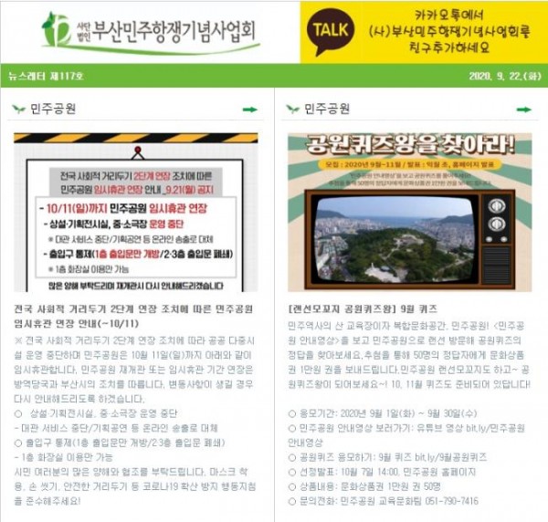 (2020.09.22)부산민주항쟁기념사업회 뉴스레터 제117호 - 민주공원 임시휴관..