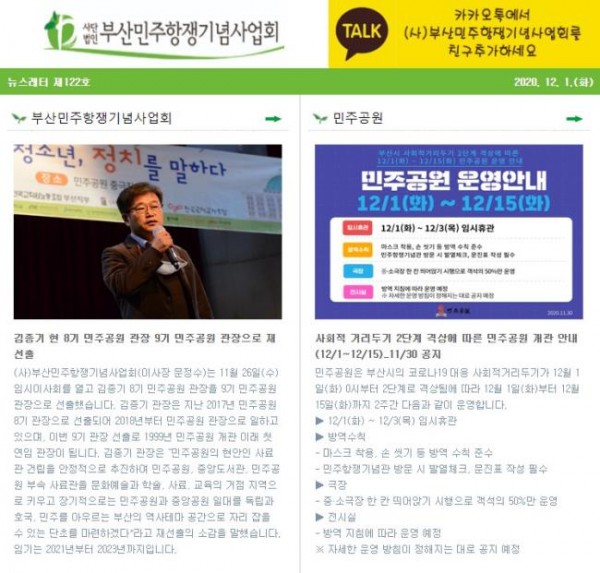 (2020.12.01)부산민주항쟁기념사업회 뉴스레터 제122호 - 민주공원 운영안내..