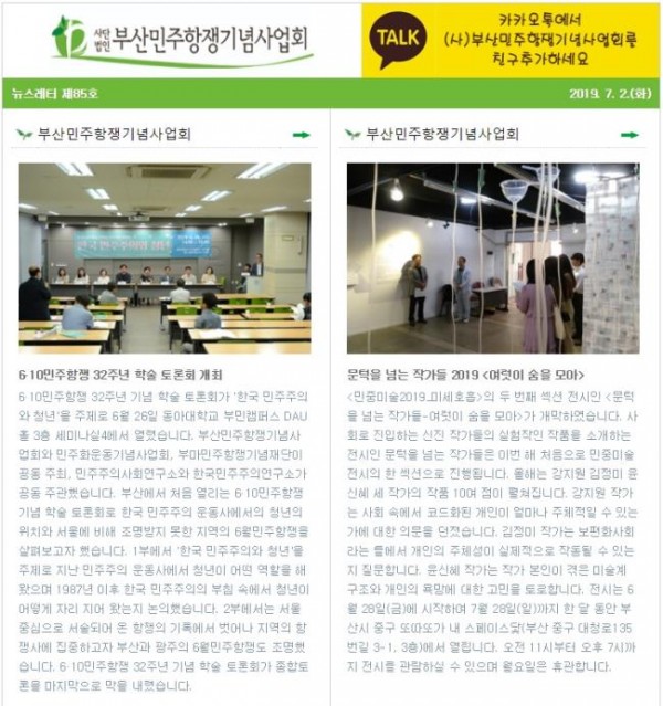 뉴스레터 제83호가 발행되었습니다. 6월 10일 오후 7시 30분 민주공원에서 열리는 <제32주년 6월민주항쟁 부산기념식과 기념문화제> 개최 소식을 전해드립니다. <민중미술 2019 - 미세호흡>, <6·10민주항쟁 32주년 기념 학…