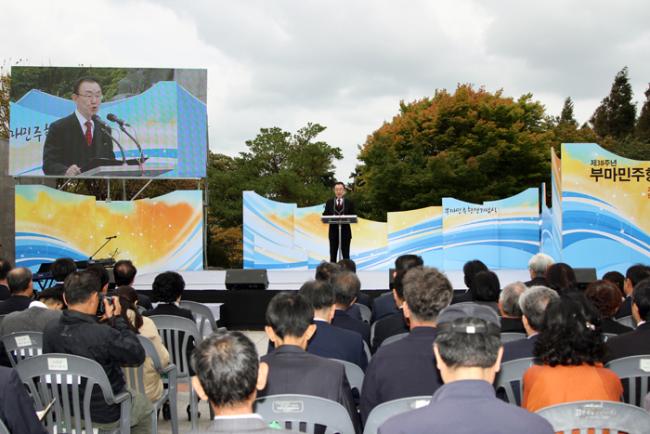 오늘 우리는 대한민국 현대 민주주의 역사의 한 전환점을 마련한 부마민주항쟁이 지닌 의미를 새롭게 되새기고자 이곳에 모였습니다. 사실 그 동안 부마민주항쟁은 1980년 5·18광주민주화운동이나 1987년 6월민주항쟁 등에 비해 상대적으로 평가절하 되어 있었습니다. 항쟁 기간이 짧고, 피해를 당한 시민들의 수가 상대적으로 적다는 점에서, 제대로 평가를 받지 못한 것입니다. 그러나 부마민주 항쟁이 장기집권을 노린 유신정권을 무너뜨림으로써 대한민국이 민주화로 나아가는 데 있어, 결정적 계기가 되었다는 점은 아무리 강조하더라도 지나칠 수가 없습니다. 그런데도 이 점이 제대로 평가되지 못했던 것입니다.