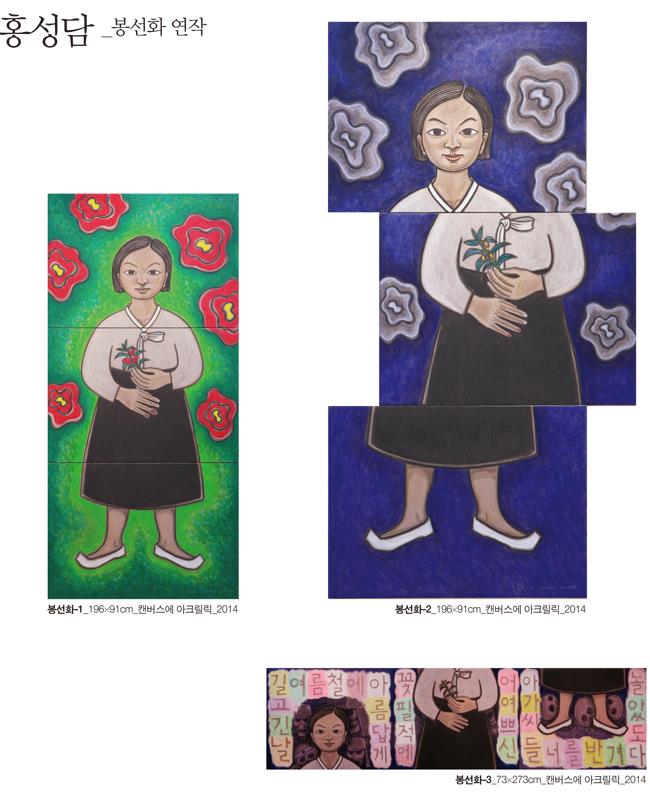 봉선화 꽃물을 들이던 조선의 소녀가 일제에 끌려가서 강간당하고 참혹하게 죽어가는 과정을 연작으로 보여주고 있는 홍성담의 작품은 그림의 틀을 빌고 있되 그림틀을 뛰어 넘는 통감각에 호소하고 있다. 위안부의 생애는 봉선화 꽃물 들이는 한 소녀의 이야기줄기로 다듬어지고 봉선화 노래말소리에 얹혀 귀를 불러낸다. 이 쓰리고 아린 촉각적 시각, 시각적 촉각을 제 눈으로 제 몸으로 오롯이 받아들이고 견뎌내야만 봉선화는 다시 피어날 수 있다.