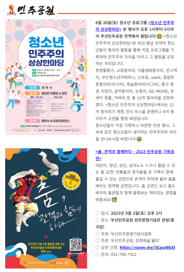 아침저녁으로는 시원해졌나 싶지만 여전히 더운 요즈음, 뉴스레터 <마루누리> 193호를 보내드립니다. 이번주 토요일! 8월 26일(토)에 열리는 <청소년 민주주의 상상한마당>, 9월 2일(토) 열리는 2023 민주공원 기획공연 <춤, 관객과 만…