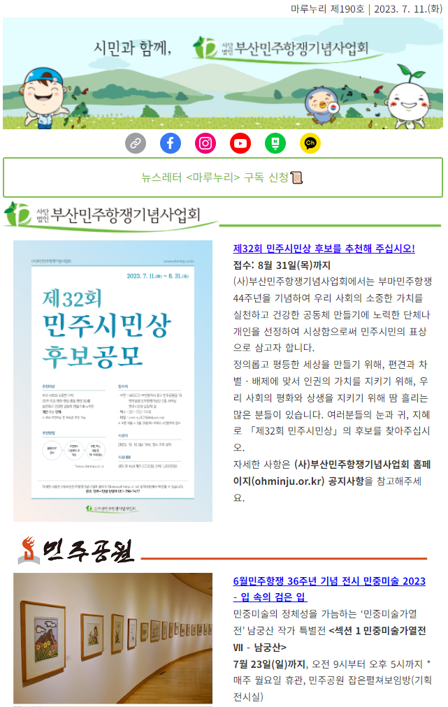 뉴스레터 <마루누리> 192호를 보내드립니다. 8월 31일까지 제32회 민주시민상의 후보를 추천할 수 있는 거 잊지 않으셨죠 민주공원과 함께하는 8월 민주달력과 8월 27일까지 펼쳐지는 6월민주항쟁 36주년 기념 전시 <민중미술 2023 입 속의 검은 …