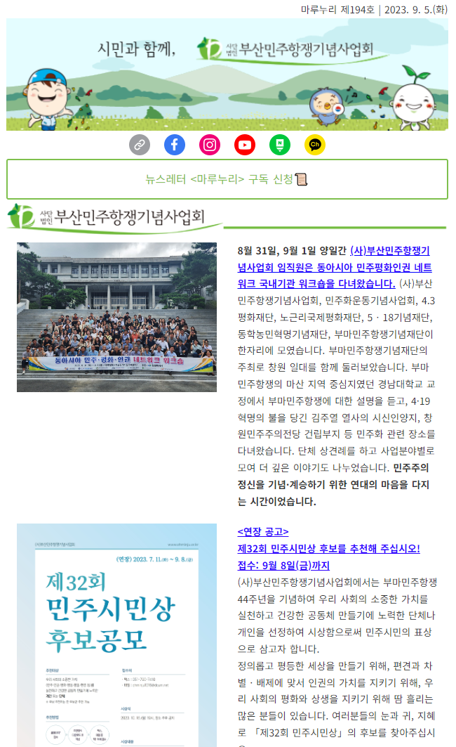 이번 추석 연휴 길다더니... 벌써 끝이라고요10월의 첫 뉴스레터, 196호 마루누리로 돌아왔습니다! 추석 전 부산지역 민주열사 유족들께 인사를 드리고 왔습니다. 모쪼록 건강하시길 바라며, 부마민주항쟁 44주년을 앞두고 제32회 민주시민상 시상식도 준비하고 있답니다.1…
