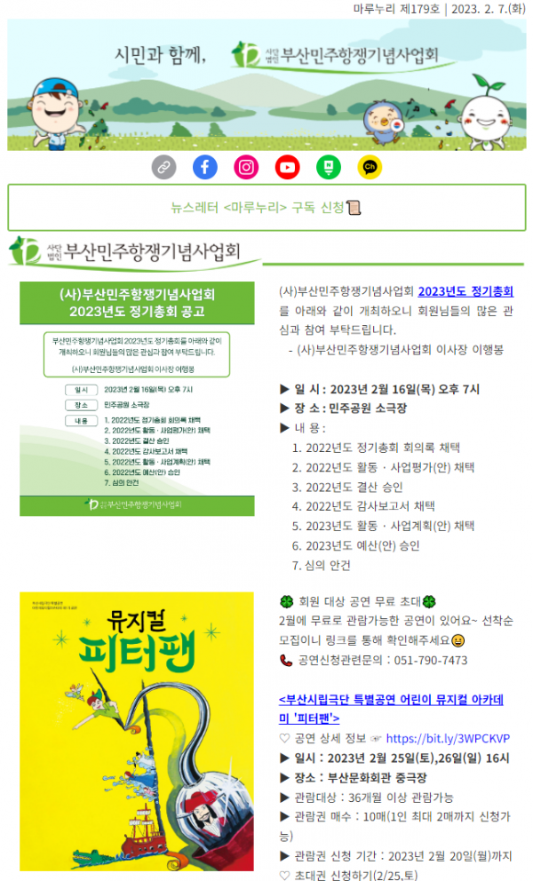 (사)부산민주항쟁기념사업회 2023년도 정기총회를 2월 16일(목) 오후 7시 민주공원 소극장에서 개최합니다. 회원 여러분의 많은 관심과 참여 부탁드립니다. 2월 회원 혜택 내용과 2월 민주달력도 전해드립니다. 2022년 연말정산에 필요한…