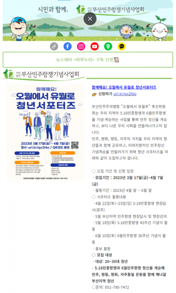 부산민주주의행동 "오월에서 유월로" 추진위원회 5.18민중항쟁과 6월민주항쟁을 기념·계승하며 민주, 평화, 평등, 자주의 가치를 우리 지역의 청년들과 함께 공유하고, 미래지향적인 민주정신 기념계승을 만들어가기 위해 청년 서포터즈를 모집하고자 합니다. 많은 관심 부탁드립…