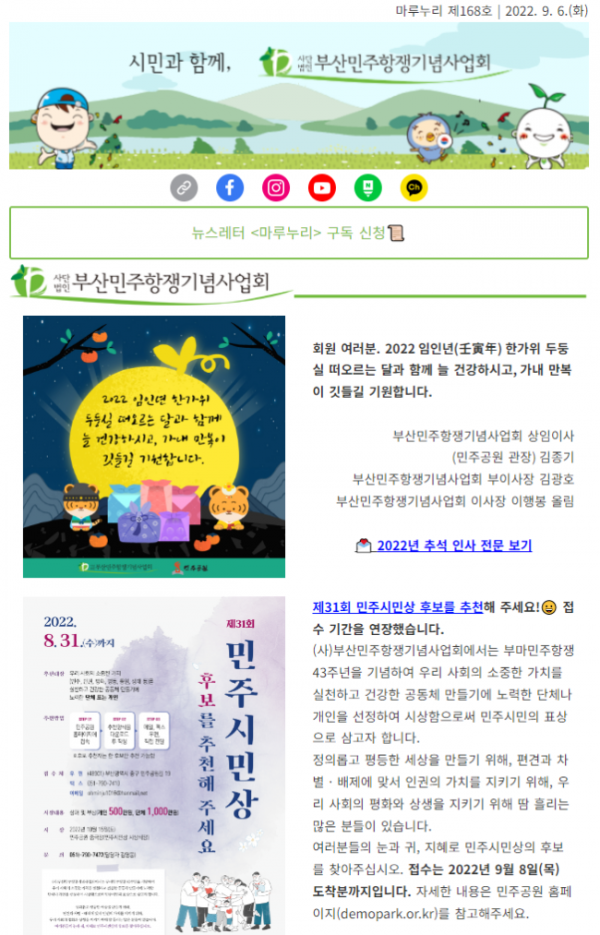 추석 인사와 함께 마루누리 168호를 보내드립니다. 우리 사회의 소중한 가치를 실천하고 건강한 공동체 만들기에 노력한 단체나 개인에게 시상하는 민주시민상의 후보자 접수를 9월 8일(목)까지로 연장했습니다. 많은 추천 부탁드립니다. 2022 임인년(壬…