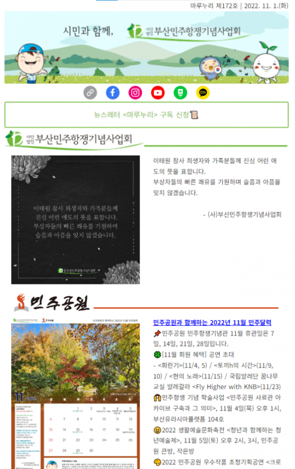 (사)부산민주항쟁기념사업회는 이태원 참사 희생자와 가족분들께 진심 어린 애도의 뜻을 표합니다. 부상자들의 빠른 쾌유를 기원하며 슬픔과 아픔을 잊지 않겠습니다.11월 민주달력에 실린 다양한 회원혜택과 행사 소식을 만나보세요. 11월 4일에는 오후 1시부터 5시까지 부산유…