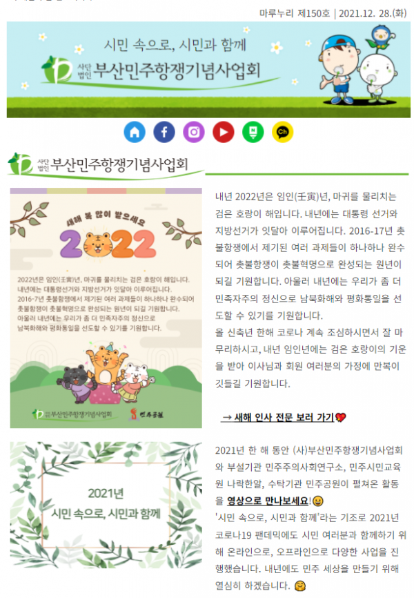 2022년 첫 번째 뉴스레터 마루누리 151호를 보내드립니다! 2021년 연말정산용 기부금영수증 발급 안내와 소식지 『민주공원』 2021년 겨울호(통권 163) 발간 소식도 전해드립니다. 검은 호랑이의 기운으로 2022년, 민주 사회를 만들기 위해 시민 여러…