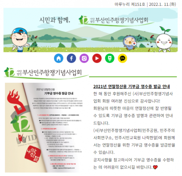 2022년 설 연휴도 함께해요! (사)부산민주항쟁기념사업회의 다양한 활동과 수탁·부설기관의 소식을 전해드리는 뉴스레터 마루누리 152호를 보내드립니다. 연말정산용 기부금영수증 발급 안내와 함께 설 연휴 민주공원 운영 안내도 전해드려요.2022년 민주공원과 함께할 청소년…