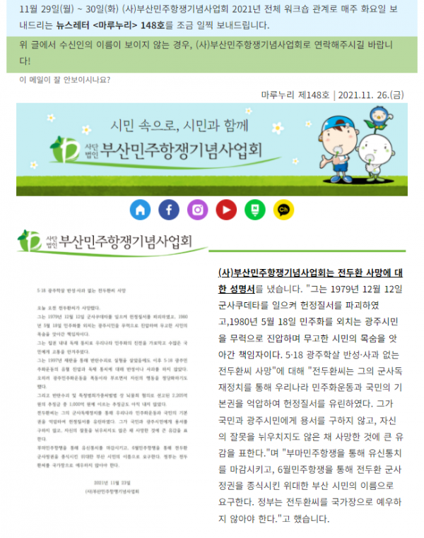 11월 민주달력을 담아 마루누리 146호를 보내드립니다. 부마민주항쟁 42주년을 기념하는 부마아카이브 전시 <이웃집 투사들>은 11월 21일(일)까지 민주공원 잡은펼쳐보임방(기획전시실)에서 열립니다. 소식지 『민주공원』 가을호(통권 162)도 발행했습니다.&…