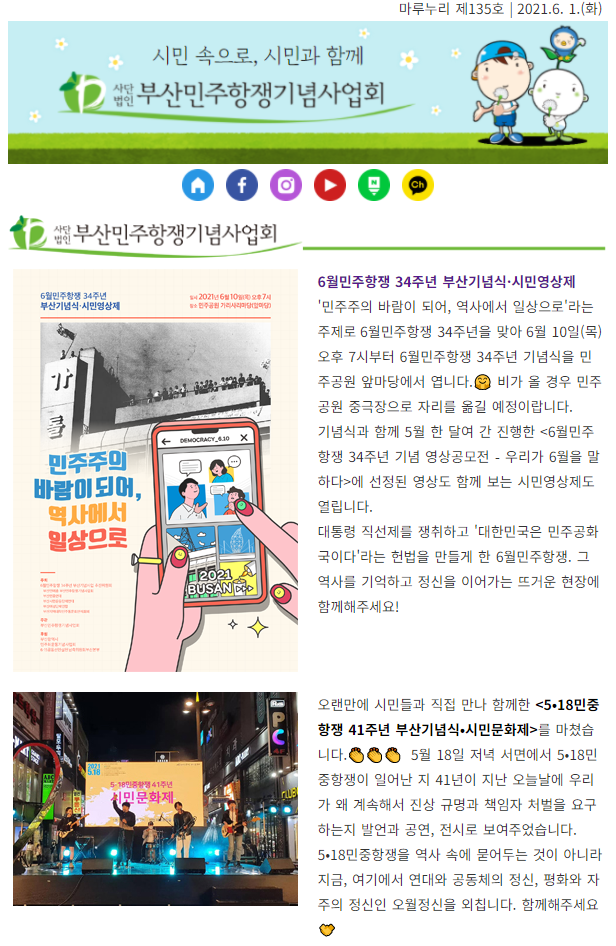 민주주의 바람이 되어, 역사에서 일상으로 6월민주항쟁 34주년 부산기념행사 소식을 담아 뉴스레터 <마루누리> 135호를 보내드려요!6월민주항쟁 34주년 부산기념식과 시민영상제는 6월 10일(목) 오후 7시부터 민주공원 앞마당에서 열립니다. 6월 10일(목)부…
