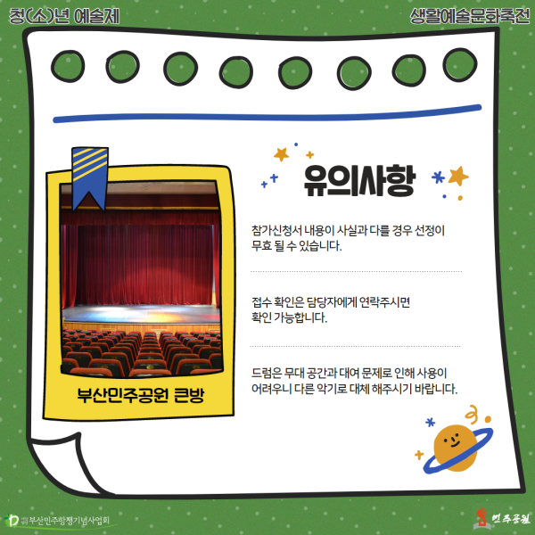 동아리 활동을 하고 있는 청소년, 청년 생활예술동아리 여러분의 많은 관심과 참여 부탁드립니다.