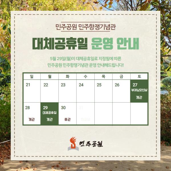5월 29일 월요일이 대체공휴일로 지정됨에 따라 민주공원 민주항쟁기념관은 29일(월) 개관, 30일(화) 휴관합니다.