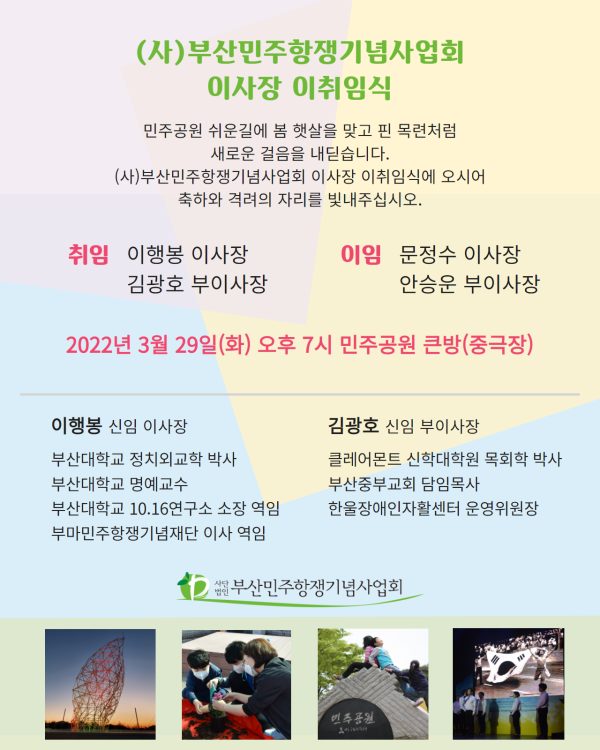 (사)부산민주항쟁기념사업회 이사장 이취임식이 3월 29일 화요일 오후 7시 민주공원 큰방(중극장)에서 열립니다. 문정수 이사장, 양승운 부이사장이 이임하며 이행봉 이사장, 김광호 부이사장이 취임합니다. 새로운 걸음을 내딛는 (사)부산민주항쟁기념사업회에 축하와 격려를 보내주세요!