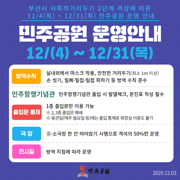 (12월 3일 공지)부산시 사회적거리두기 2단계 격상에 따른 12/4(목) ~ 12/31(목) 민주공원 운영 안내