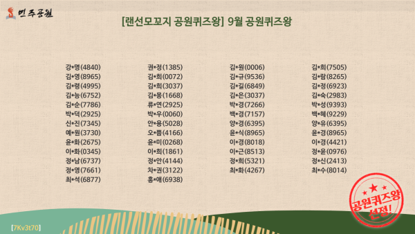 민주공원 온라인탐방 '랜선모꼬지 공원퀴즈왕'에 참여해 주신 모든 분들에게 감사드립니다. 퀴즈정답과 9월공원퀴즈왕 50명을 알려드립니다. 앞으로도 민주공원 프로그램에 많은 관심과 참여 바랍니다. 감사합니다.