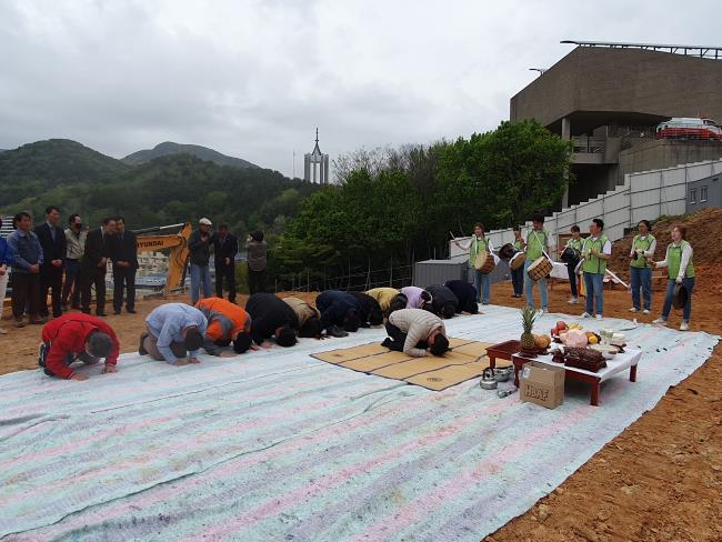4월 14일 오전 민주공원 부속건물(사료관) 건립 부지에서 <민주공원 부속건물(사료관) 착공 맞이 한마당>을 열었습니다. 민주공원 풍물패 '바깥놀이마당'의 길놀이를 시작으로 김종기 민주공원 관장이 축문을 읽었습니다. 이행봉 (사)부산민주항쟁기념사업회 이사장은 고사상에 술을 올리며 건립 공사 기간 동안 안전을 기원했습니다. 중앙공원, 서구사회복지관, 부산광복회 등 인근 기관 임직원과 공사와 감리를 맡고 있는 건설사 임직원이 모두 참석한 뜻깊은 자리였습니다. 시민과 함께하는 열린 사료관을 건립하기 위해 힘쓰겠습니다.