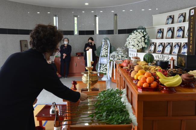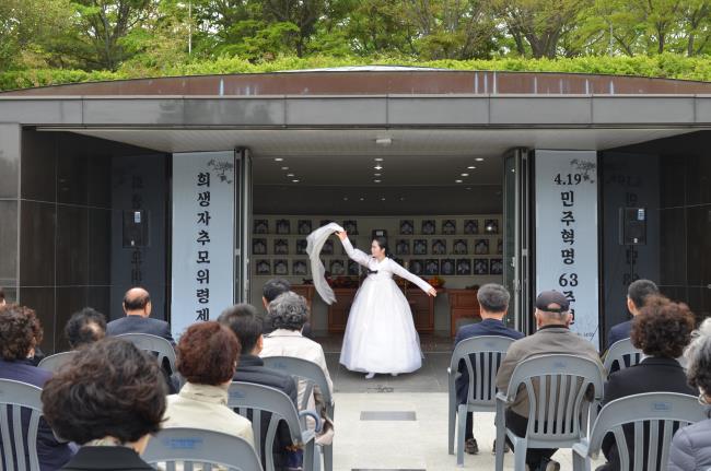 자유, 민주, 정의를 위해 숭고하게 희생한 4·19혁명희생자 영령에 대한 경례와 묵념을 올리고 추모위령 제문을 낭독, 헌주와 재배, 헌화가 이어졌습니다. 부산시무형문화재 제10호 동래고무 이수자인 김경미 선생이 4·19혁명 희생자들의 넋을 기리는 진혼무를 췄습니다.