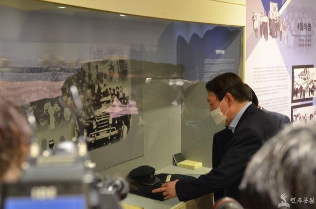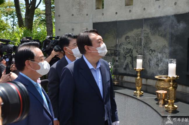 윤석열 제20대 대통령선거 예비후보가 7월 27일(화) 오전 11시 민주공원을 찾아 넋기림마당에서 민주주의를 위해 희생하신 민주열사와 애국영령에 대한 참배했습니다. 참배 후 김종기 민주공원 관장과 함께 넋기림마당에 있는 이태춘, 황보영국, 박종철 열사의 추모비와 민주항쟁기념관 늘펼쳐보임방(상설전시실)을 둘러보았습니다. 늘펼쳐보임방에서 부산 민주화운동의 역사와 4대 항쟁 관련 전시물을 살펴보았습니다.