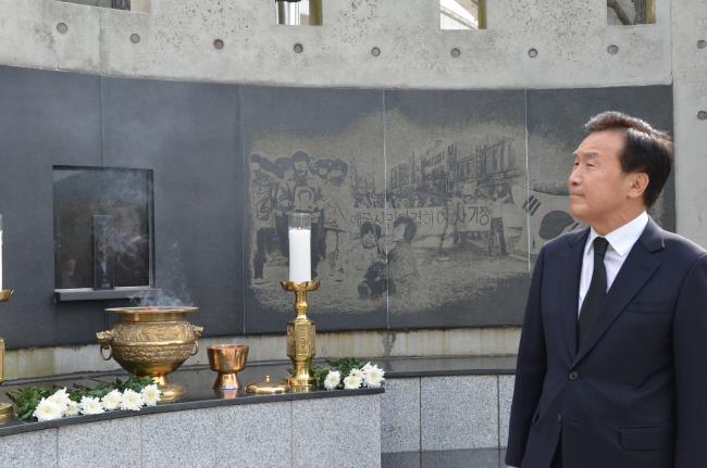 바른미래당 손학규 대표와 부산 경남 지역 바른미래당 당원 및 당직자가 7월 5일 민주공원을 찾아 넋기림마당에서 참배를 했습니다. 손학규 대표는 헌화와 분향 후 민주공원 넋기림마당 조형물인 '민주의 이름'을 찬찬히 둘러보았습니다.