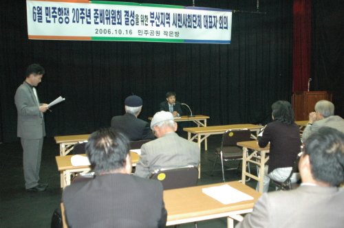 대표자 회의 작성자 민주공원 작성일 2006-10-18 조회수 150 - 첨부파일 : 08.JPG (130.8K) - 다운로드 0 2023-12-26 17:36:32 목록 본문 2006년 10월 16일 민주공원 작은방(소극장)6월민주항쟁 20주년 준비위원회 결성을 위한 부산지역 시민사회단체 대표자 회의 목록 목록으로