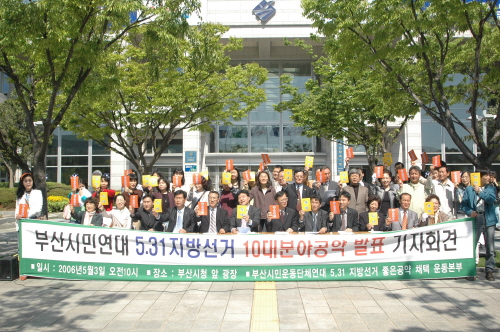 5.31지방선거 10대분야공약 발표 기자회견 작성자 민주공원 작성일 2006-05-04 조회수 148 - 첨부파일 : 05.JPG (199.4K) - 다운로드 0 2023-12-19 16:35:29 목록 본문 부산시민연대 5.31지방선거 10대분야공약 발표 기자회견2006년 5월 3일 부산시청 앞 광장 목록 목록으로
