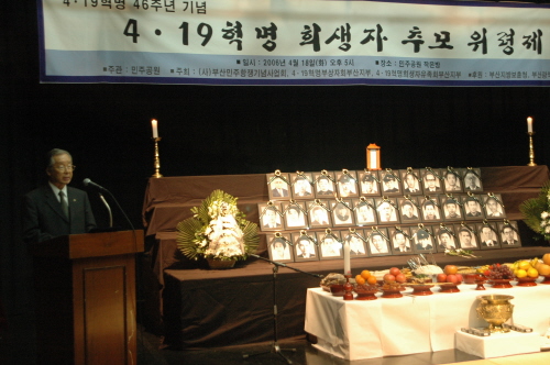 부산민주항쟁기념사업회는 4.19혁명희생자유족회와 4.19혁명부상자회 회원, 시민등이 참가한 가운데 4.19항쟁 추모 위령제를 거행했다.