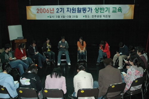2006년 상반기 자원활동가 교육 작성자 민주공원 작성일 2006-03-22 조회수 139 - 첨부파일 : 14.JPG (133.0K) - 다운로드 0 2023-12-19 15:48:59 목록 본문 2006년 3월 11~12일 민주공원 작은방(소극장)환한 표정으로 교육을 받고 있는 "2006 새내기 자원활동가들" 목록 목록으로