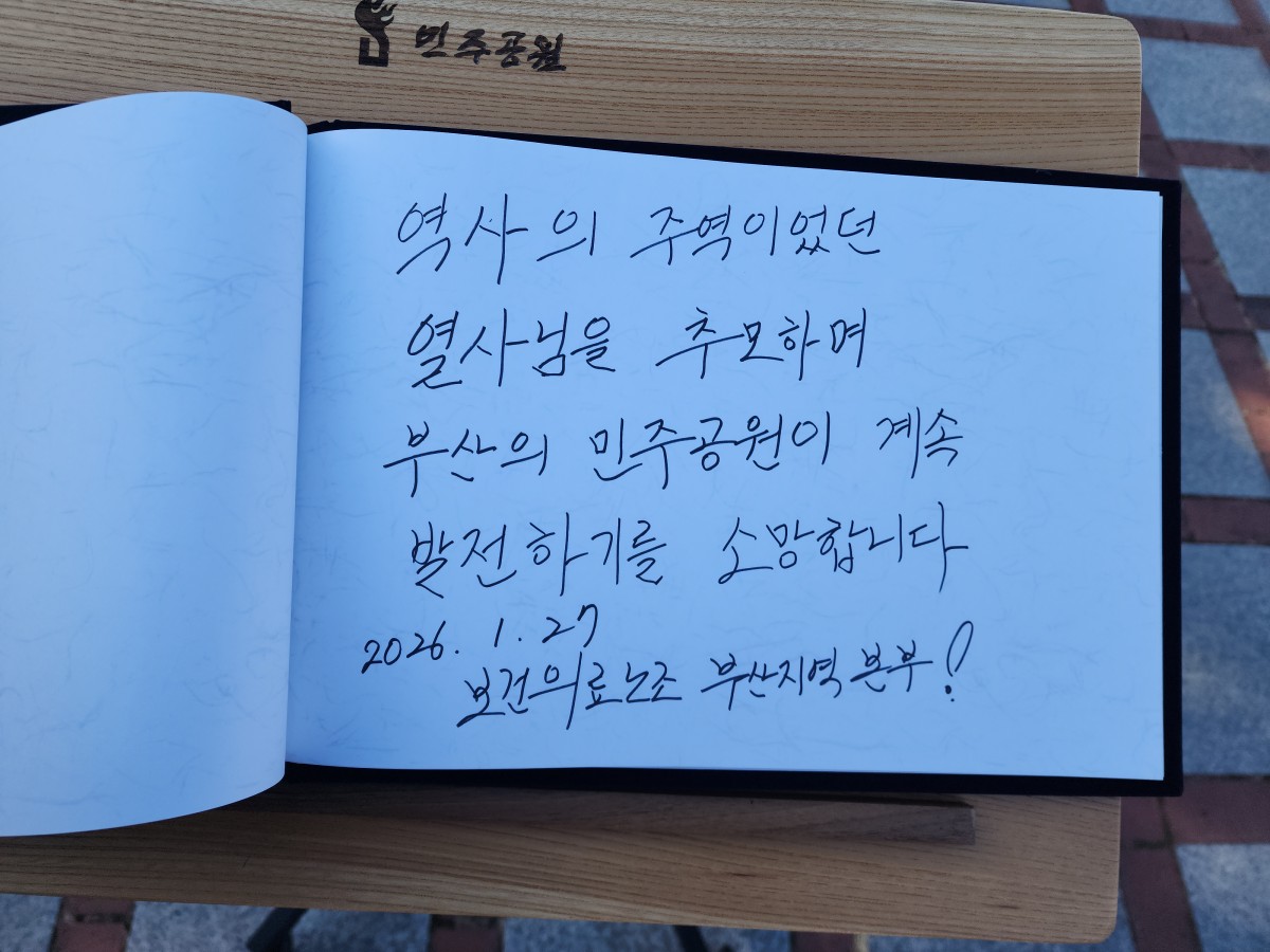 참배 후 "역사의 주역이었던 열사님을 추모하며 부산의 민주공원이 계속 발전하기를 소망합니다"라는 글을 남겼습니다.