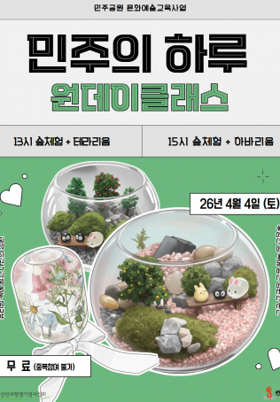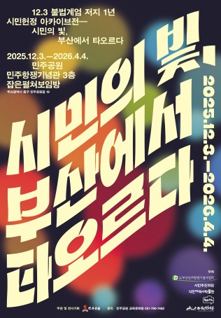 일정 전체 67건 (1페이지) 전체보기 예매준비중 예매중 예매마감 진행중 종료 전체 공연 전시 행사 축제 체험 기타 검색 무료 문화예술교육 - 민주의하루 원데이 클래스 장소 민주공원 민주항쟁기념관 소극장 기간 2026-04-04(토) ~ 2026-04-04(토) 시간 13시 숲체험 + 테라리움, 15시 숲체험 + 하바리움 상세보기 무료 무료관람 12.3 불법계엄 저지 1년 시민헌정 아카이브전 <시민의 빛, 부산에서 타오르다> 2024년 12.3 불법계엄 1주기를 맞아, 윤석열 정권 친위쿠데타에 맞서 민주주의를 지켜낸 부산시민의 저항과 연대를 되새기는 전시 장소 민주공원(민주항쟁기념관) 3층 잡은펼쳐보임방(기획전시실) 기간 2025-12-03(수) ~ 2026-04-04(토) 시간 09:00~18:00 매주 월요일 휴관 상세보기 무료관람 행사종료 2025 Dance Project EGERO 기획공연<12> 춤 작가 양성 프로젝트 [몸틀: 네 가지 시선] 장소 민주공원 작은방 기간 2025-11-22(토) ~ 2025-11-23(일) 시간 22일(토) 17시, 23일(일) 15시 상세보기 행사종료 2025 민주공원 생활예술문화축전 장소 민주공원 민주항쟁기념관 큰방 기간 2025-11-01(토) ~ 2025-11-01(토) 시간 15:00 상세보기 행사종료 민주주의기록관 개관 기념_기록의 집을 짓다 부산 최초의 민주화운동 기록 수집기관인 민주주의 기록관 개관을 기념하여 기록과 예술을 함께 공유하는 전시 장소 민주공원 민주항쟁기념관 기획전시실(잡은펼쳐보임방) 기간 2025-10-16(목) ~ 2025-11-28(금) 시간 09:00~18:00 상세보기 행사종료 2025 민주공원 예술놀이터 '공원춤판' 장소 민주공원 민주항쟁기념관 작은방 기간 2025-09-20(토) ~ 2025-09-20(토) 시간 14:00 상세보기 행사종료 공동후원전시 제 1회 부마미술제 <기억하는 산> 展 ‘기억하는 산’이란 주제로 부마 민주항쟁을 예술로 재조명하고 민주주의 가치를 되새기는 전시 장소 민주공원 잡은펼쳐보임방(기획전시실) 기간 2025-09-06(토) ~ 2025-10-10(금) 시간 09:00~18:00 상세보기 행사종료 2025 민주공원 기획공연 '숙희책방' 장소 부산민주공원 민주항쟁기념관 큰방 기간 2025-09-13(토) ~ 2025-09-13(토) 시간 14:00 상세보기 행사종료 3회 청소년 민주주의 상상한마당 장소 민주공원 전역 기간 2025-08-30(토) ~ 2025-08-30(토) 시간 13시~17시 상세보기 행사종료 식민지구 2025_우주 눈 지구 눈물 연안 습지와 자연을 우주의 시선으로 조망하여 환경, 생태, 생명의 문제를 예술작품으로 풀어낸 전시 장소 기획전시실 잡은펼쳐보임방 기간 2025-08-05(화) ~ 2025-08-31(일) 시간 09:00~18:00 상세보기 열린1페이지 2페이지 3페이지 4페이지 5페이지 6페이지 7페이지 맨끝