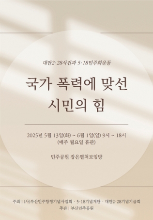 일정 전체 67건 (2페이지) 전체보기 예매준비중 예매중 예매마감 진행중 종료 전체 공연 전시 행사 축제 체험 기타 검색 행사종료 [선착순 마감] 2025 민주공원 기획공연 '옹알스 오리지널쇼' 장소 부산민주공원 민주항쟁기념관 큰방(중극장) 기간 2025-07-05(토) ~ 2025-07-05(토) 시간 15:00 상세보기 행사종료 광복80돌맞이 기념전시 <독립하는 광복> 광복 80년을 맞아 역사와 기억을 예술로 풀어낸 전시 장소 잡은펼쳐보임방(기획전시실) 기간 2025-06-10(화) ~ 2025-07-27(일) 시간 09:00~18:00 상세보기 행사종료 2025 민주공원 예술놀이터 샌드아트 공연&체험 장소 부산민주공원 작은방(소극장) 기간 2025-06-21(토) ~ 2025-06-21(토) 시간 14:00 상세보기 행사종료 2025 Dance Project EGERO 제7회 정기공연 [염증] 장소 부산민주공원 소극장 기간 2025-06-14(토) ~ 2025-06-15(일) 시간 2025년 6월 14일(토) PM 5:00 2025년 6월 15일(일) PM 3:00 상세보기 행사종료 국가 폭력에 맞선 시민의 힘 대만2·28사건과 5·18민주화운동 장소 잡은펼쳐보임방(기획전시실) 기간 2025-05-13(화) ~ 2025-06-01(일) 시간 9:00~18:00(매주 월요일 휴관) 상세보기 행사종료 2025 어린이날 민주공원 놀이터 행사 안내 장소 부산민주공원 기간 2025-05-05(월) ~ 2025-05-05(월) 시간 10:30 ~ 16:00 상세보기 행사종료 2025 민주공원 예술놀이터 '공원 노닐기 & 헤드폰을 써보세오' 장소 부산민주공원 장승터 기간 2025-04-11(금) ~ 2025-04-11(금) 시간 11:00 헤드폰을 써보세오 12:30 아카펠라공연 상세보기 행사종료 제12회 삼일절 맞이 어린이 태극기 그리기 대회 개최 공고 장소 기간 2025-02-24(월) ~ 2025-03-12(수) 시간 상세보기 행사종료 우리들의 상상으로 그리는 태극기 이야기 광복 80주년, 2025 민주공원 문화예술교육사업 어린이 태극기 그리기 대회 수상작 전시&체험 장소 부산민주공원 민주항쟁기념관 잡은펼쳐보임방(기획전시실) 기간 2025-02-25(화) ~ 2025-03-30(일) 시간 09:00~18:00 상세보기 행사종료 2024 부마민주항쟁 아카이브 순회전 장소 민주항쟁기념관 3층 기간 2024-11-01(금) ~ 2024-12-08(일) 시간 10:00~17:00 상세보기 처음 1페이지 열린2페이지 3페이지 4페이지 5페이지 6페이지 7페이지 맨끝